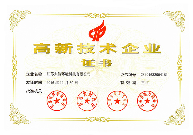 江蘇大信環(huán)境科技有限公司于2016年11月30日取得江蘇省科學技術(shù)廳、江蘇省財政局、江蘇省國家稅務(wù)局、江蘇省地方稅務(wù)局批準的《高新技術(shù)企業(yè)證書》,證書編號:GR201632004161。
