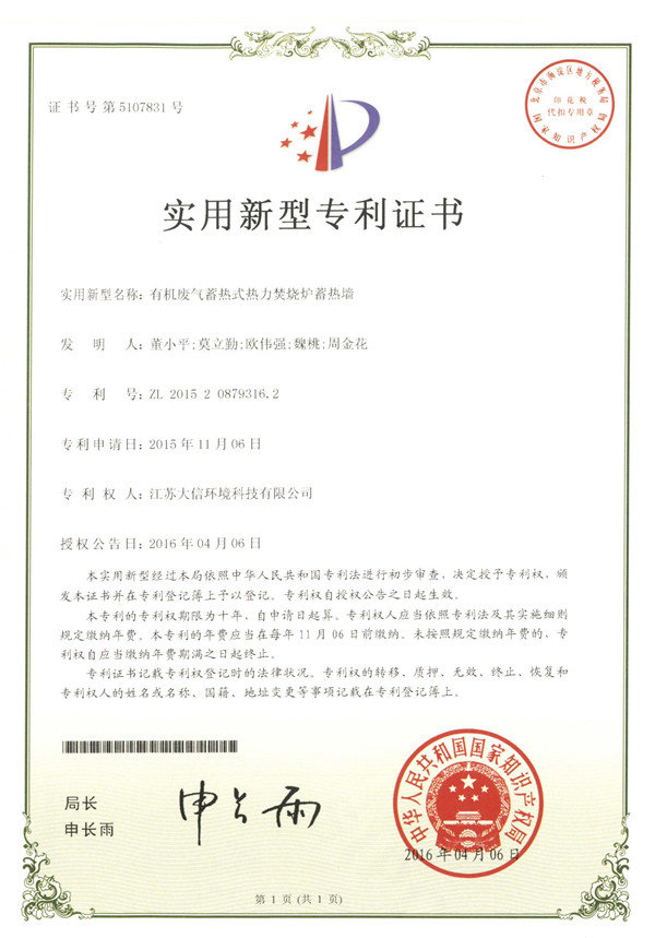 有機(jī)廢氣蓄熱式熱力焚燒爐蓄熱墻專利證書