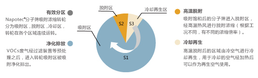 轉(zhuǎn)輪濃縮是采用固體吸附床對有機(jī)氣體進(jìn)行吸附濃縮,轉(zhuǎn)輪兩側(cè)由特制的密封裝置分成三個區(qū)域:吸附區(qū)、脫附區(qū)及冷卻區(qū)域。經(jīng)預(yù)處理過濾去除漆霧、塵雜及水氣后的廢氣,通過緩慢旋轉(zhuǎn)的轉(zhuǎn)輪式沸石分子篩吸附床、廢氣均勻地通過旋轉(zhuǎn)床斷面,由于沸石分子篩具有的吸附能力、有機(jī)廢氣分子通過沸石轉(zhuǎn)輪并經(jīng)一定的駐留時間,達(dá)到吸附去除有機(jī)物的目的;在再生區(qū)域,轉(zhuǎn)輪進(jìn)入再生區(qū)吸附在轉(zhuǎn)輪上的有機(jī)物在熱空氣的作用下從沸石內(nèi)脫附出來,揮發(fā)物送至脫附系統(tǒng)進(jìn)行處理實(shí)現(xiàn)再生,再生經(jīng)冷卻后可重新進(jìn)行吸附,隨著轉(zhuǎn)輪的不斷轉(zhuǎn)動,吸附、脫附、冷卻循環(huán)進(jìn)行,確保廢氣處理持續(xù)穩(wěn)定的運(yùn)行。